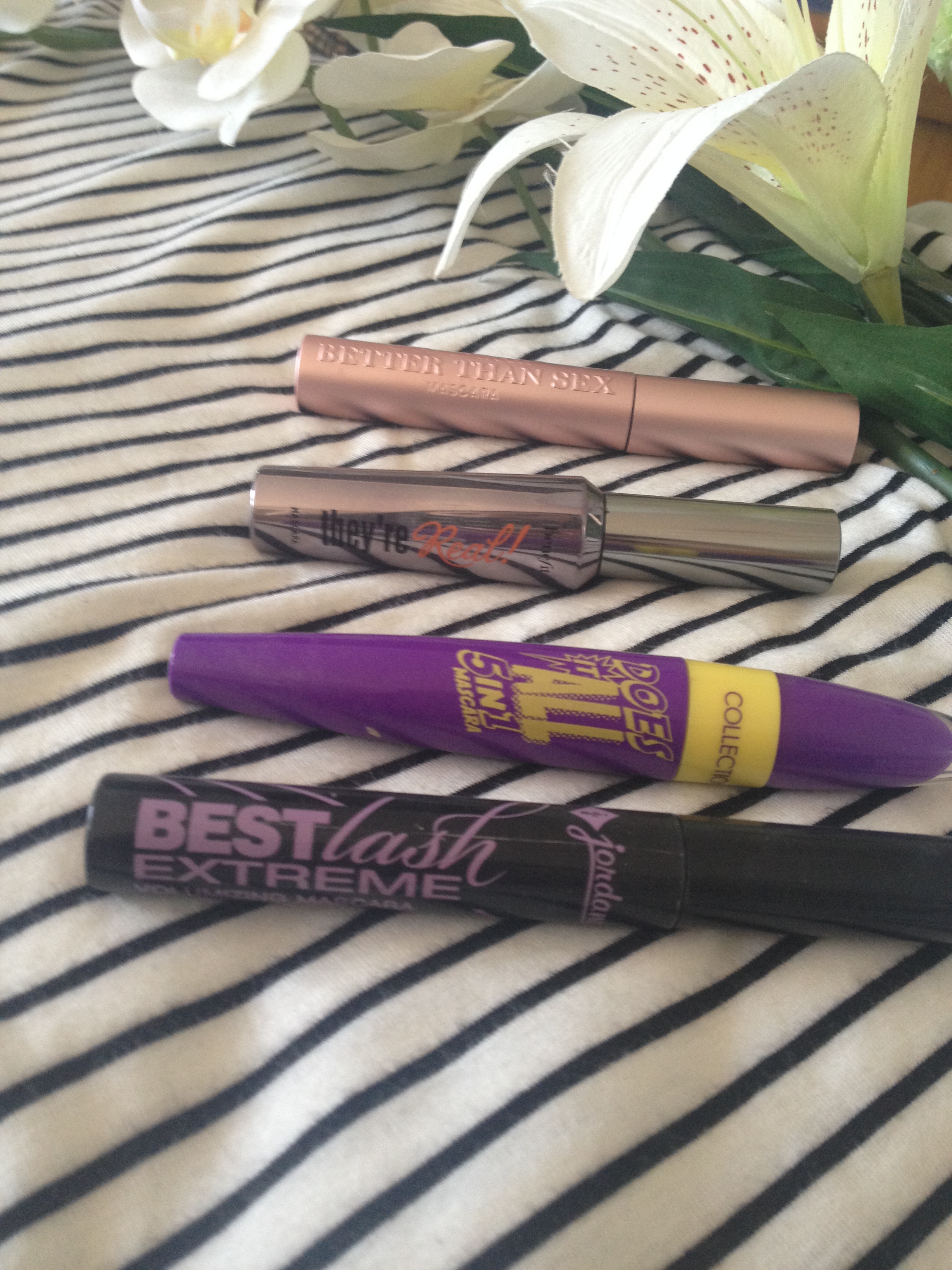 From top to bottom; Too Faced ‘Better Than Sex’ mascara ($29.60AUD), Benefit ‘They’re Real’ mascara ($45 NZ), Collection ‘Does It All’ mascara ($17.49) and Jordana ‘Best Lash Extreme’ mascara ($3.59 US).