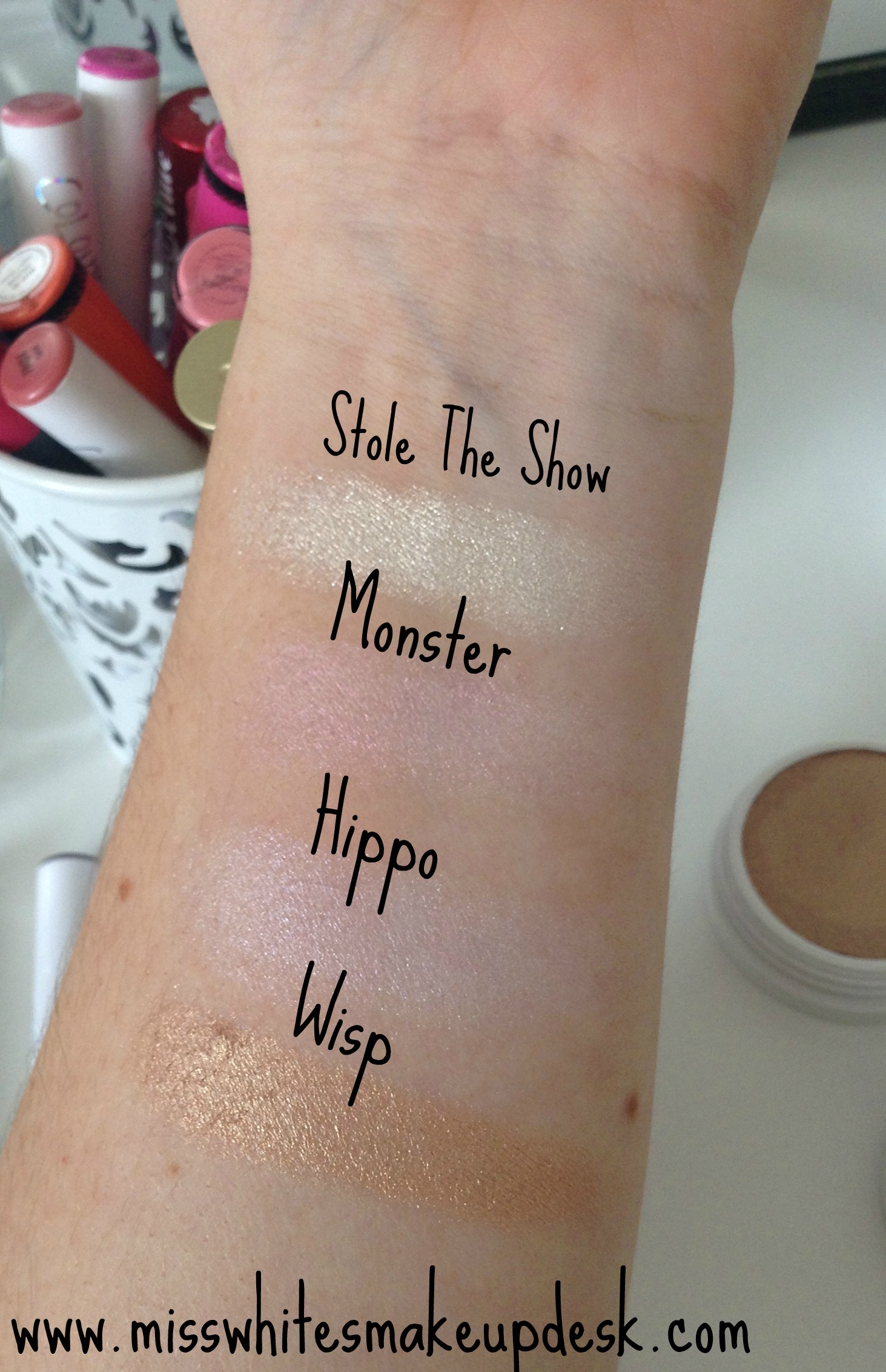 My FAVOURITE shade has to be Monster – it’s like a bright, light coloured shade with this amazing duo chrome pink shimmery amazingness to it. Like, you’ll see on the swatches below that it’s got this gorgeous pink sheen to it and it comes up AMAZING on the cheek. It honestly is the most outstanding highlighter I’ve ever used. It looks unreal with a light pink blush and I ALWAYS get compliments when I wear it. I wore it the other day and one of the girls in my class looked at me for a moment and proclaimed – “Miss White, you have a really nice face!”. I put it all down to this highlighter.