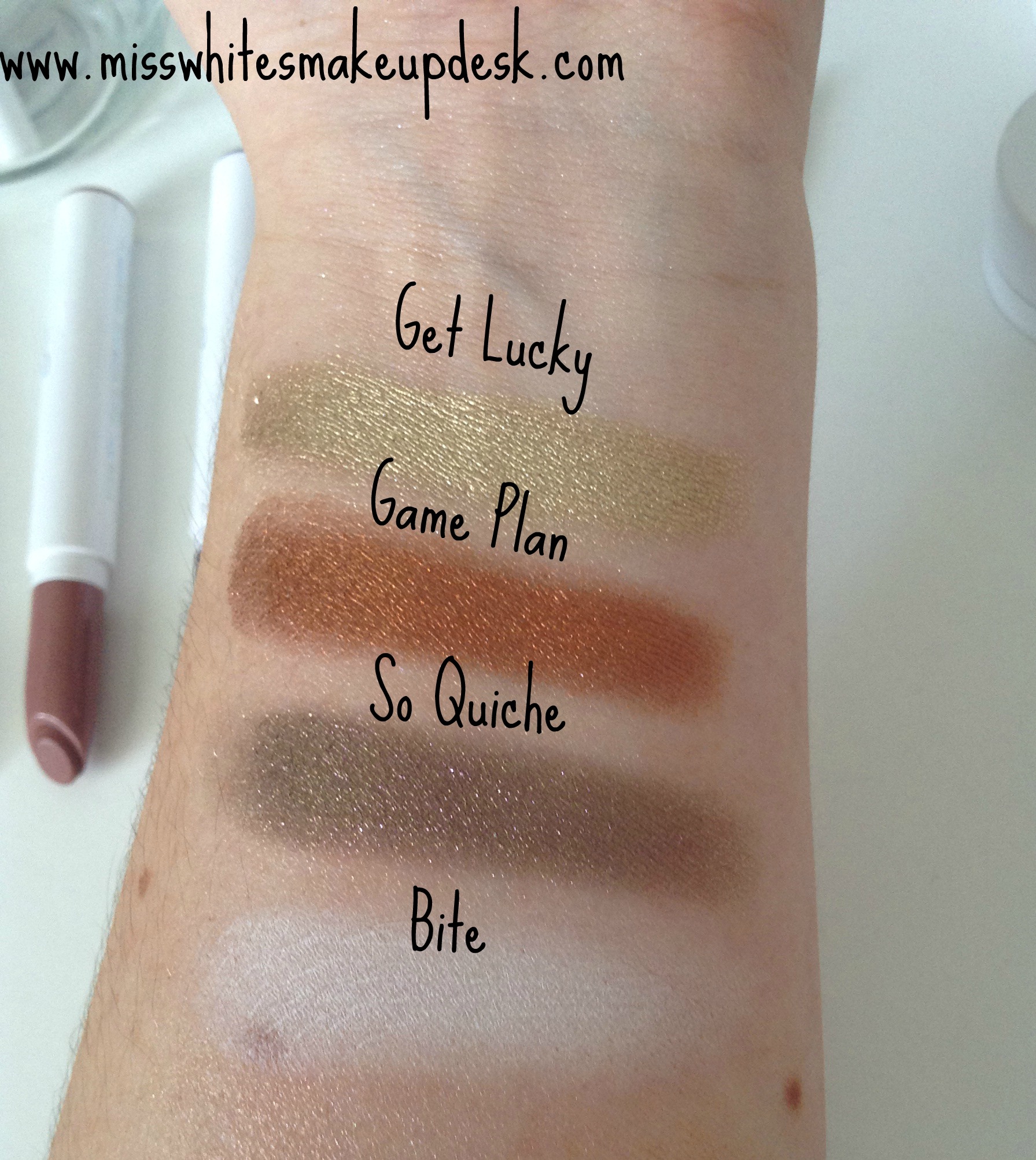 I bought four Super Shock Eye Shadows in the colours (from left to right) Bite, Game Plan, Get Lucky and So Quiche.